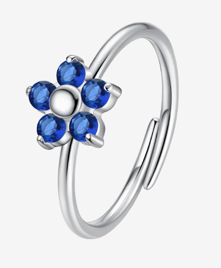 Anello donna in acciaio con fiore e zircone blu Misura regolabile Misura fiore: 8 x 8 mm Diametro zirconi: 2,5 mm. Ispirato alla bellezza della natura, questo gioiello incanta con il suo design floreale raffinato. Perfetto per chi desidera aggiungere un tocco di delicatezza e grazia al proprio stile quotidiano, trasmette una sensazione di freschezza e femminilità .