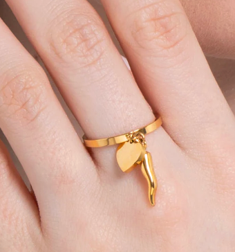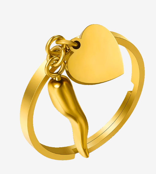 Anello donna in acciaio IP gold con corno e cuore. Misura regolabile