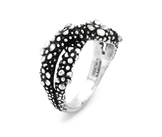 L’anello Millefiori Giovanni Raspini esprime tutta la sua raffinata eleganza nel design a doppia fascia sovrapposta. La lavorazione artigianale della fusione a cera persa su argento brunito, è qui abbinata all’effetto della diamantatura, che conferisce ai minuscoli e graziosi petali in argento un effetto scintillante.