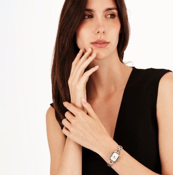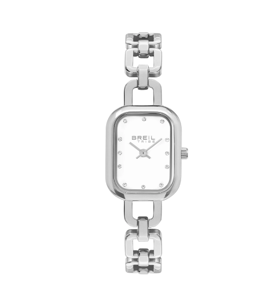 L’orologio solo tempo da donna Bon Ton è realizzato interamente in acciaio e si distingue per la cassa squadrata che richiama il design delle maglie del bracciale. Il quadrante è illuminato da piccoli cristalli al posto degli indici: un dettaglio che lo trasforma da semplice segnatempo a vero gioiello dallo charme vintage.