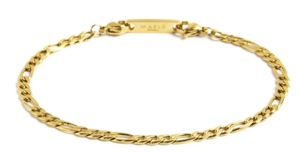 Bracciale con catena figaro di 3.80 mm, regolabile tramite Marlù logo tag removibile. La chiusura doppia è con una texture a righe e logo Marlù incisi.