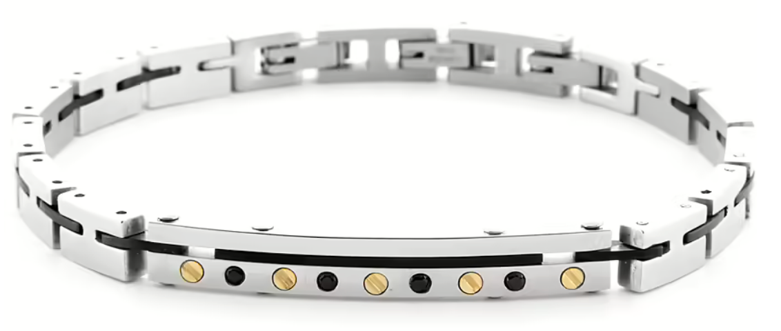 Bracciale da uomo di 4US Cesare Paciotti. Bracciale in acciaio e inserto in oro 18k e spinelli di colore nero. Regolabile dal 18 al 21cm.