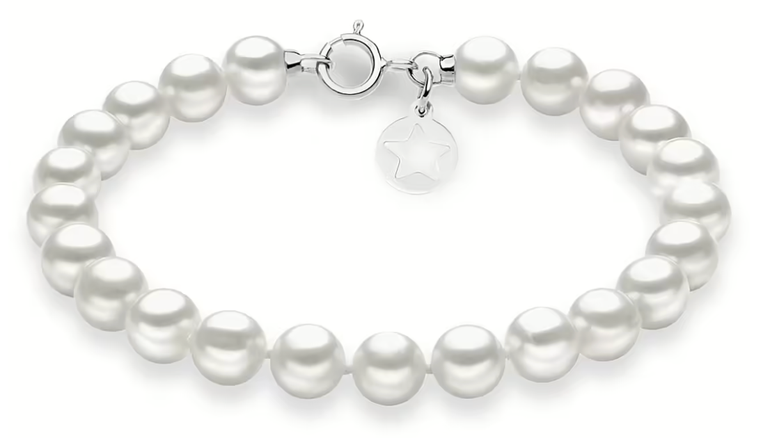 Bracciale Comete della collezione Storia di Luce 375 da donna. Bracciale in oro bianco 375‰ con perle coltivate Qualità Basic Ø4,5/5 mm e charm a forma di stella in argento 925‰. Lunghezza 18 cm.