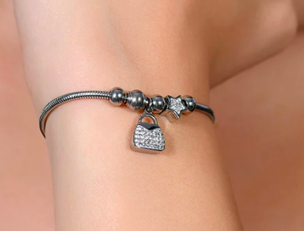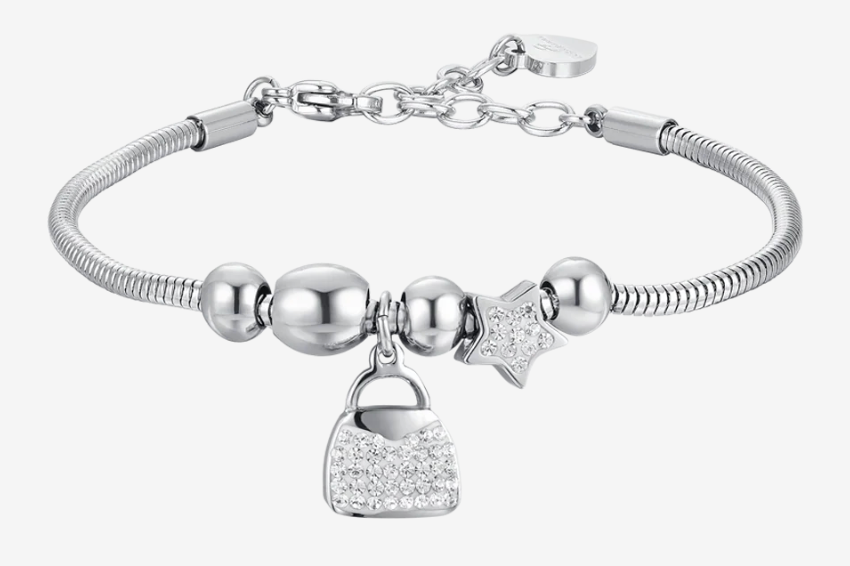 Bracciale Donna in acciaio con borsa e stella con cristalli bianchi. Lunghezza: 16,5+3 cm. Misura borsa: 11x 14 mm. Misura stella: 8 x 8 mm. La borsa è un simbolo di moda e femminilità, mentre la stella rappresenta la speranza e l’aspirazione verso nuovi orizzonti. L’aggiunta dei cristalli bianchi aggiunge un tocco di luce e raffinatezza al bracciale, creando un effetto scintillante e suggestivo. Perfetto come regalo per una fashionista o per celebrare un momento speciale, questo bracciale catturerà l’attenzione e incanterà con la sua bellezza e il suo stile unico.