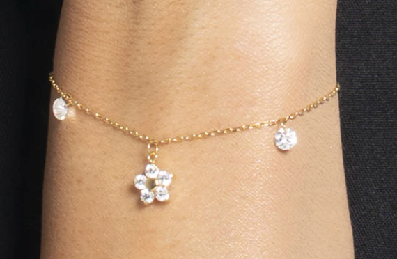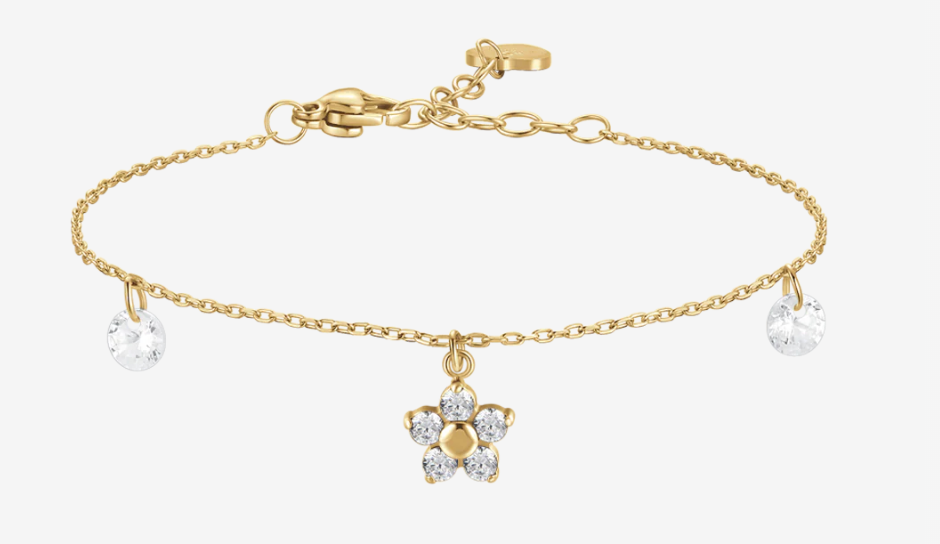 Bracciale donna in acciaio con pendente fiore e zircone bianchi colore oro Lunghezza: 16 + 3 cm Misura fiore: 8 x 8 mm Diametro zirconi: 4 mm. Ispirato alla bellezza della natura, questo gioiello incanta con il suo design floreale raffinato. Perfetto per chi desidera aggiungere un tocco di delicatezza e grazia al proprio stile quotidiano, trasmette una sensazione di freschezza e femminilità .