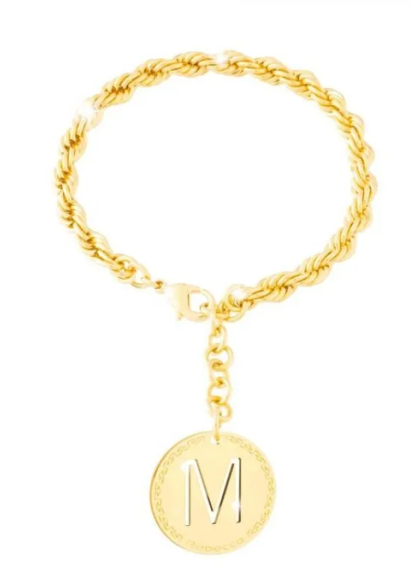 Bracciale da Donna modello con maglia a corda in bronzo anallergico placcatura oro giallo 24 carati impreziosito da una medaglia pendente con lettera “M”