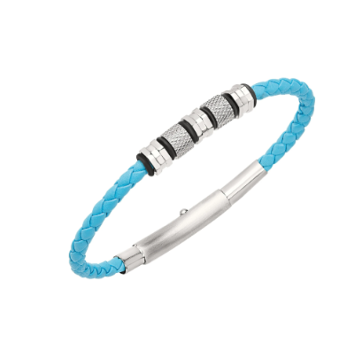 Il bracciale da uomo Wonderlust è in pelle turchese intrecciata, decorata da piccoli elementi in acciaio. Un gioiello estremamente contemporaneo che bilancia in maniera perfetta modernità e artigianalità. La chiusura scorrevole diventa anch’essa un elemento decorativo e permette la regolazione della misura.