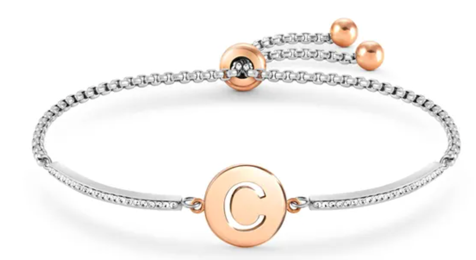 Bracciale con simbolo con Lettera C in Acciaio 316/304 anallergico, dettagli in PVD rosa e pavé di Cristalli bianchi. Lunghezza 19 cm, adattabile a 14 cm. Misura del simbolo 1,2 x1,2 cm. Made in P.R.C. Scegli l’iniziale della persona del tuo cuore!