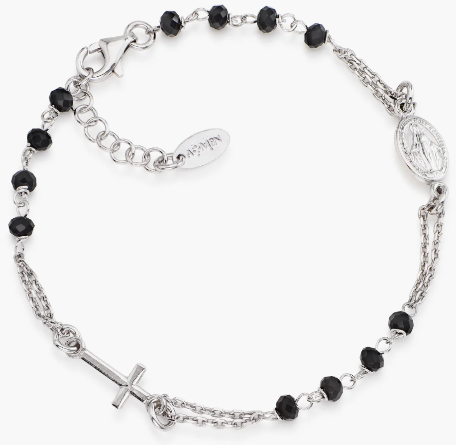 Bracciale rosario in argento 925 a finitura rodiata con grani da 3 mm di cristalli neri sfaccettati, croce e medaglietta rappresentante la Madonna Miracolosa. Il bracciale ha lunghezza regolabile da 18 a 20 cm con chiusura a moschettone e catenina di allungo.