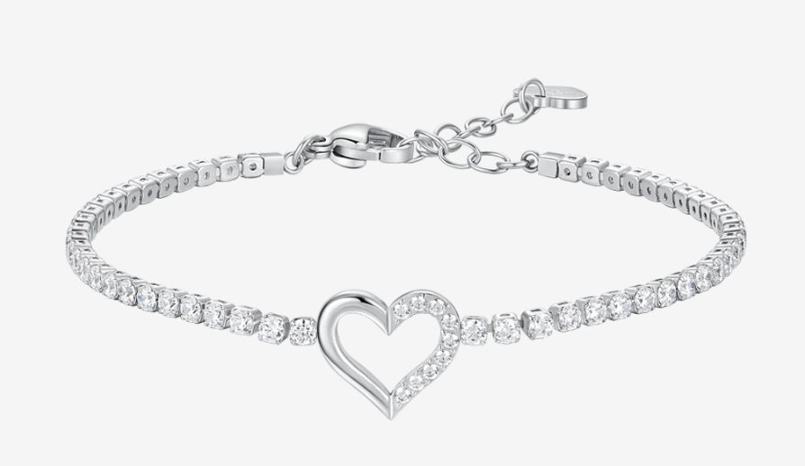 Bracciale tennis donna in acciaio con cuore e punti luce di zircone bianco Lunghezza: 15,5 + 3 cm Misura cuore: 11 x 10 mm Diametro zirconi: 1,5 mm. Simbolo intramontabile di amore e dolcezza, questo gioiello a forma di cuore è pensato per esprimere sentimenti profondi. Un dono perfetto per un’occasione speciale o per portare con sè un messaggio d’affetto ogni giorno.