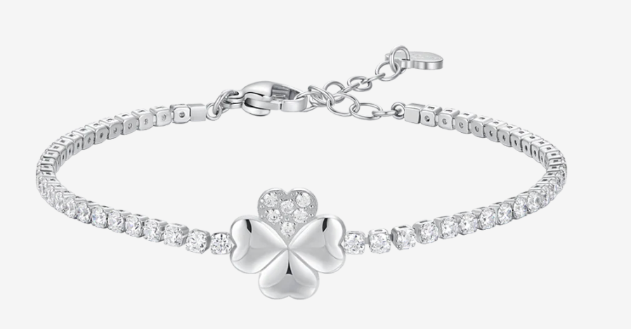 Bracciale tennis donna in acciaio con quadrifoglio e punti luce zircone bianco Lunghezza: 15,5 + 3 cm Misura quadrifoglio: 11 x 11 mm Diametro zirconi: 1,5 mm. Un gioiello dal design moderno e versatile, perfetto per essere indossato ogni giorno o in momenti speciali. Realizzato con cura, si adatta a ogni stile esaltando la personalità di chi lo indossa.