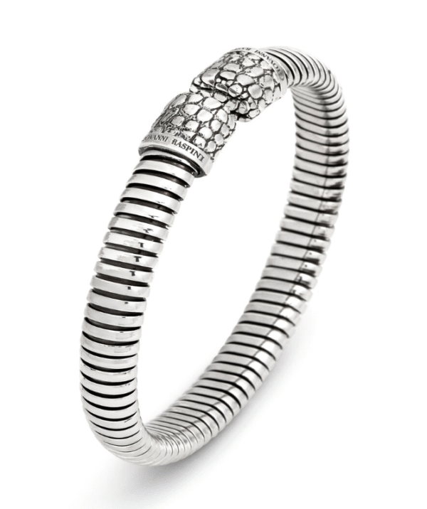 Ispirato ad un evergreen della gioielleria dal Novecento ad oggi, questo bracciale rigido in argento in maglia tubogas è elegante ed avvolgente. Giovanni Raspini lo reinterpreta con un tocco distintivo: l’iconica texture coccodrillo, che impreziosisce le estremità realizzate in fusione a cera persa. Un gioiello intramontabile, dal carattere deciso. Per indossare il bracciale consigliamo di farlo scorrere dolcemente sulla pelle allargandolo al minimo al fine di mantenerne inalterata la struttura.