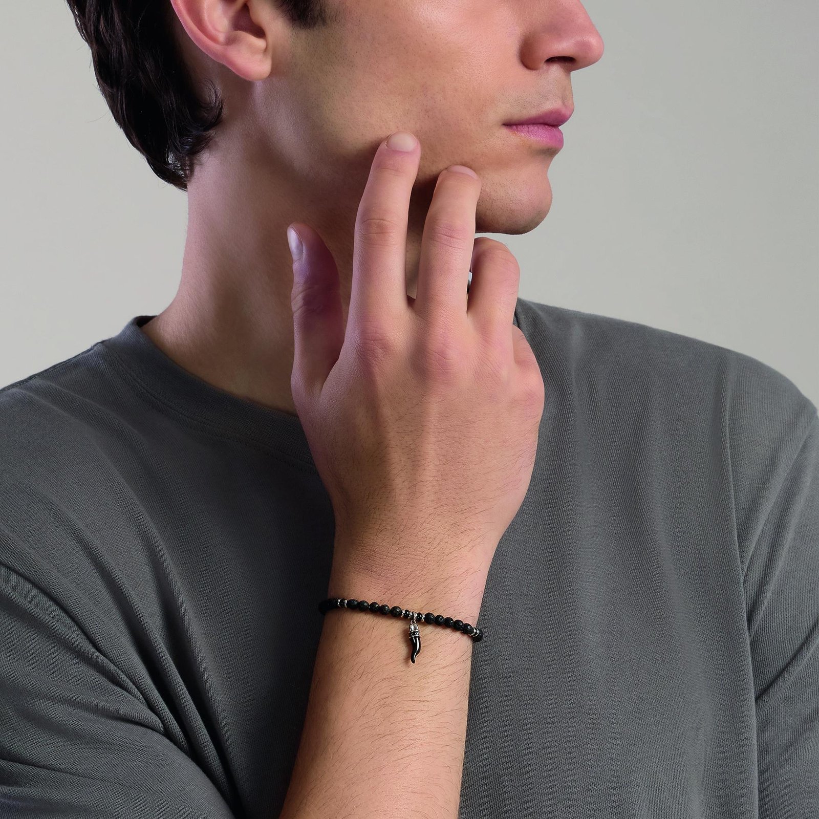Bracciale uomo in acciaio con pietra lavica e cornetto