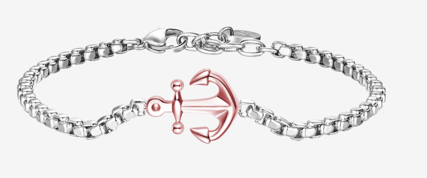 Bracciale uomo in acciaio IP rose con ancora. Lunghezza: 19 + 3 cm Misura ancora: 17 x 14 mm . Valorizza il tuo stile con questo bracciale in acciaio IP rose, un colore moderno e sofisticato. L’ancora centrale simboleggia stabilità ed è perfetta per chi ama accessori unici.