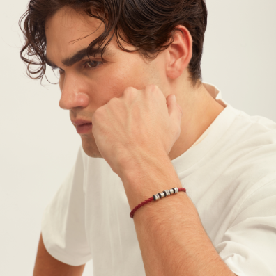 Il bracciale da uomo Wanderlust è in pelle borgundy intrecciata, decorata da piccoli elementi in acciaio. Un gioiello estremamente contemporaneo che bilancia in maniera perfetta modernità e artigianalità. La chiusura scorrevole diventa anch’essa un elemento decorativo e permette la regolazione della misura.