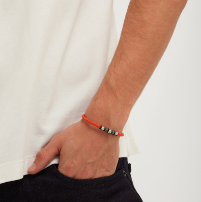 Il bracciale da uomo Wanderlust è in pelle intrecciata color arancione, decorata da piccoli elementi in acciaio. Un gioiello estremamente contemporaneo che bilancia in maniera perfetta modernità e artigianalità. La chiusura scorrevole diventa anch’essa un elemento decorativo e permette la regolazione della misura.
