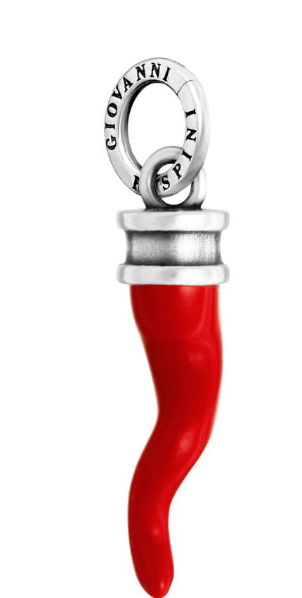 Un classico piccolo corno portafortuna in resina, color rosso corallo, sormontato da un delizioso cappuccio realizzato in argento fuso a cera persa. Fatto a mano in azienda.
