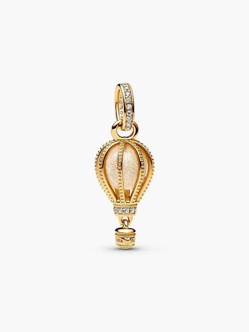 Indossa questo Charm Pendente Mongolfiera rifinito in Oro per ricordare i tuoi viaggi o come simbolo dei luoghi che sogni di visitare. Il charm dalle tonalità calde, rifinito a mano, presenta corde decorate da microsfere che racchiudono una sfera in vetro di Murano trasparente glitterato, mentre l’anello passante e la base del pallone sono decorati da un pavé scintillante di zirconia cubica incolore. Sotto, una piccola cesta ti aspetta per portarti ovunque tu voglia. Indossa questo gioiello per lasciarti ispirare ogni giorno o regalalo a una persona che è pronta a vivere una nuova avventura.