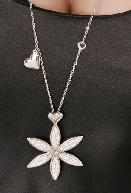 Collana in acciaio con fiore della vita con cristalli bianchi. Lunghezza: 75 + 5 cm Diametro ciondolo: 38 mm