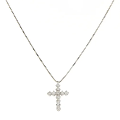 Un gioiello raffinato e simbolico che aggiunge un tocco di eleganza a qualsiasi outfit. Il pendente a forma di croce è impreziosito da diamanti naturali per un totale di 0.10 carati, garantendo una brillantezza straordinaria.