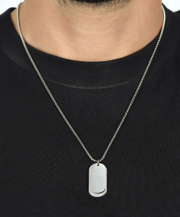 Collana Uomo in acciaio con piastre personalizzabili silver. Lunghezza: 50 + 5 cm. Piastra grande: 14 x 27 mm. Piastra piccola: 12 x 24 mm. Questa Collana da Uomo in Acciaio con Piastre Personalizzabili Silver è un’espressione di stile unico e personalità. Le piastre silver offrono uno sfondo perfetto per esprimere il tuo messaggio o aggiungere un tocco personale all’accessorio. Le piastre personalizzabili rendono questa collana unica nel suo genere. Hai la possibilità di incidere un nome, una data speciale o una dedica, rendendo questo gioiello un tesoro significativo e speciale.