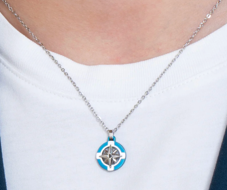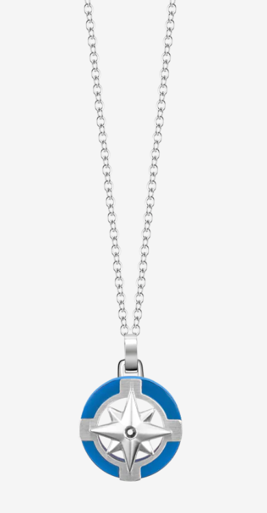 Collana uomo in acciaio con rosa dei venti e dettaglio blu. Lunghezza: 45 + 5 cm Misura ancora: 19 x 14 mm. Unisci eleganza e originalità con questa collana in acciaio. Il ciondolo raffigurante la rosa dei venti è arricchito da un dettaglio blu che aggiunge un tocco unico.