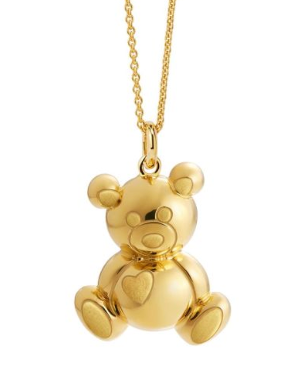 Ciondolo “Gli Orsetti” in argento placcato oro con dettagli in raso, su collana in argento placcato oro.
