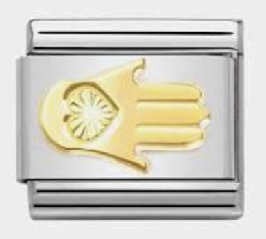 Questo link Composable Classic originale è realizzato in acciaio inossidabile con dettagli in oro giallo 18 K e presenta al centro il simbolo della Mano di Fatima (Hamsa) inciso con dettagli raffinati. È pensato per aggiungere un tocco di stile e significato al tuo bracciale componibile Nomination, simboleggiando protezione, felicità, pace e prosperità.