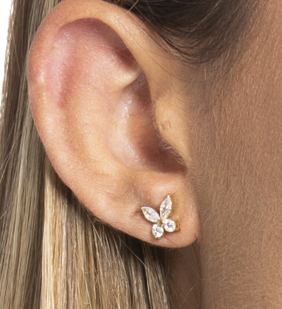 Mono orecchino donna in acciaio con farfalla con ali zircone bianco colore oro Misura farfalla: 8 x 8 mm Diametro zirconi: 2,5 mm. Eleganza e funzionalità si incontrano in questo accessorio in acciaio, pensato per chi ama i dettagli curati e uno stile senza tempo. Un complemento perfetto per ogni outfit.