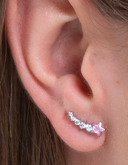 Mono Orecchino in acciaio con stella rosa e cristalli bianchi. Lunghezza: 14 mm.