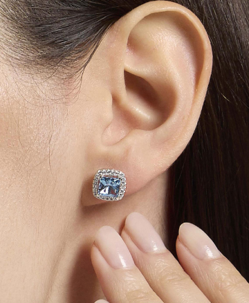 Orecchini a lobo in argento e zirconi bianchi e acquamarina sintetica taglio princess.