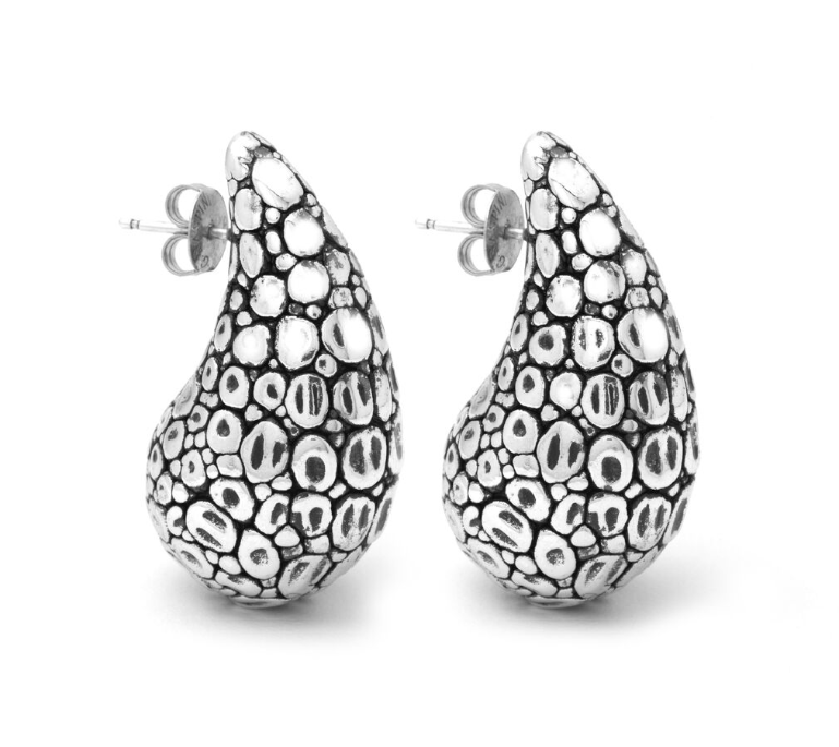 Questi orecchini valorizzano la materia rendendola contemporanea, sviluppando il tema stilistico della goccia d’acqua. Realizzati in argento, vuoti all’interno e quindi leggerissimi, mostrano l’elegante texture di coccodrillo che regala al volto grande luminosità.