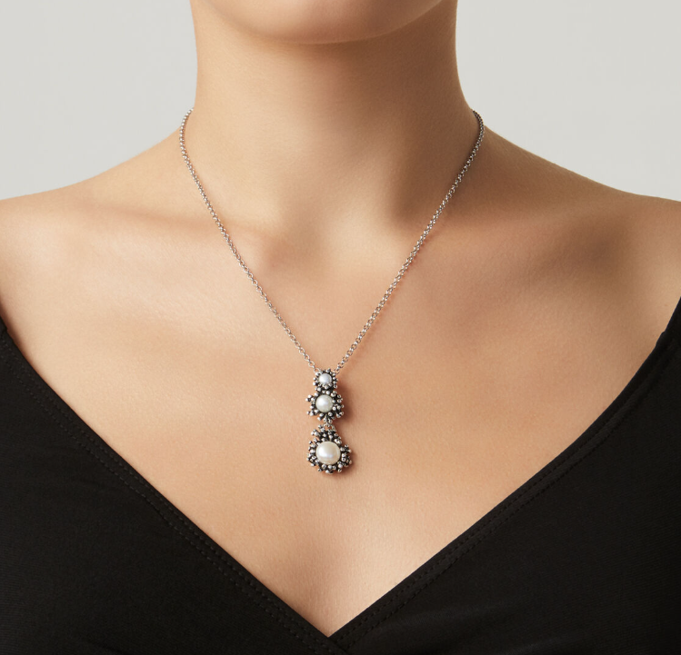 Eleganza e indosso impeccabile per il pendente Anemone Mini, realizzato completamente a mano in argento brunito e perle naturali. In esso il decoro naturalistico si fonde magicamente con la delicatezza delle perle di fiume e il fascino eterno delle profondità marine.