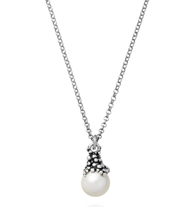 Un incontro luminoso fra una grande perla d’acqua dolce e l’argento brunito. Eleganti decori Perlage per questo bellissimo pendente, munito di catena in argento di 45 centimetri. Fatto a mano.