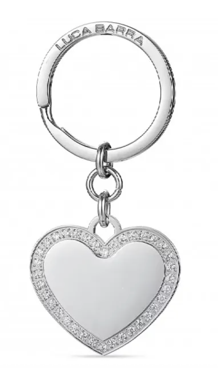 Portachiavi in acciaio con targhetta da 3x3cm con zirconi bisnchi e superficie liscia per incisione .