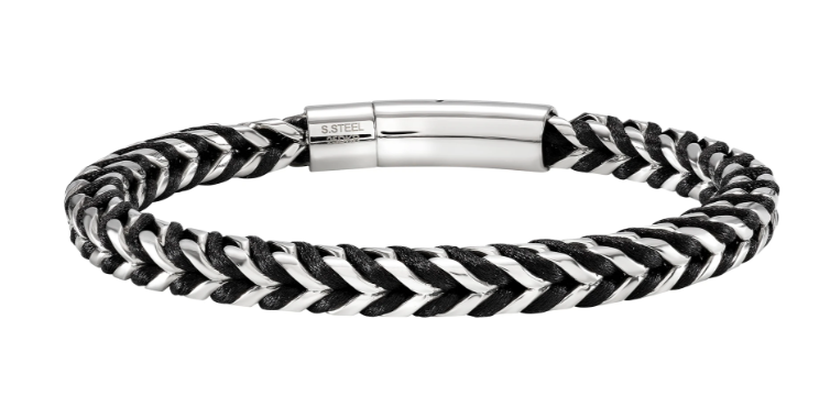 Il bracciale Shakle si distingue per la sua catena in acciaio lucido, che si intreccia con un filo nero creando un contrasto deciso e contemporaneo. La combinazione dei due elementi dà vita a un design dinamico e ricercato, perfetto per chi cerca un accessorio capace di aggiungere personalità a qualsiasi look.