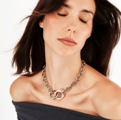 Le forme iconiche di Tetra, squadrata e forma tonda con goccia, assumono volumi bold e si intersecano tra di loro. La collana Tetra Goes Big si distingue per i due elementi centrali intrecciati, uno squadrato con apertura tonda e l’altro tondo con goccia e apertura quadrata. Il tocco bold, enfatizzato anche dalla catena, dà carattere a ogni outfit, perfetta da indossare da sola è l’accessorio ideale per chi vuole osare.